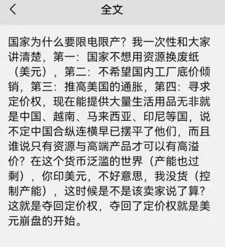 为了一个所谓的碳达峰,就这么停了?这不是中了欧美人的圈套么?中国的每一项政策都是由精英层反复推敲后才制定的,只做对中国有利的事情。我们的确是和欧美约定了碳达峰,但那是因为条款对我们有利,至少是互利双赢,我们绝不可能单方面损耗自己去满足欧美的无理要求,东风核导弹不是吃素的如果给制造业无限制供电能给中国带来极大的好处,那什么东西都挡不住中国扩大电力供应。疫情爆发后,全世界制造业半瘫痪,产能大减,订单雪花一样的飞到了中国。目前,全世界的货船都往中国开,合全世界之力从中国拉货,而全球其他地方出港的船大半都是空船。中国制造扬眉吐气,以前都是我求订单,没想到现在是订单求我。如果真的赚肿了,国家现在怎么可能对制造业企业拉闸限电,什么破碳排放指标都扔一边去,明年再说。假如中国制造是一个整体,那碰到这种供不应求,全世界都来中国求货的状况,肯定是狠狠的提价,大赚一笔。但现在的状况是明明是全世界都求着中国出货,结果中国产品的出厂价就是提不上去。无论订单规模有多大,中国工厂都吃得下去,然后迅速扩张出对应的产能出来。一件T恤只赚1块钱,工厂居然也接单,甚至还敢扩产能。中国的企业太零散了,这东西的技术门槛也确实不高,于是就进行了充分激烈的市场厮杀,只要还能赚一点钱,就没人敢提价。这么多的订单全部造出来后,积压如山,全部堆在仓库里等着装船。表面上看,中国制造红红火火,订单无数,实际上几乎所有的工厂都成了船运公司的下属,免费长工那种。海运敢涨价,几倍几倍的涨价,但中国制造就是不敢涨价,哪怕全球订单求着中国发货也不敢涨价,这就是目前的现状。除了海运涨价,原材料也在疯狂涨价,各种原材料都涨,全都是翻倍的那种涨。